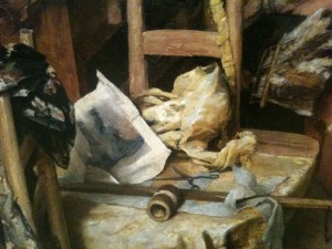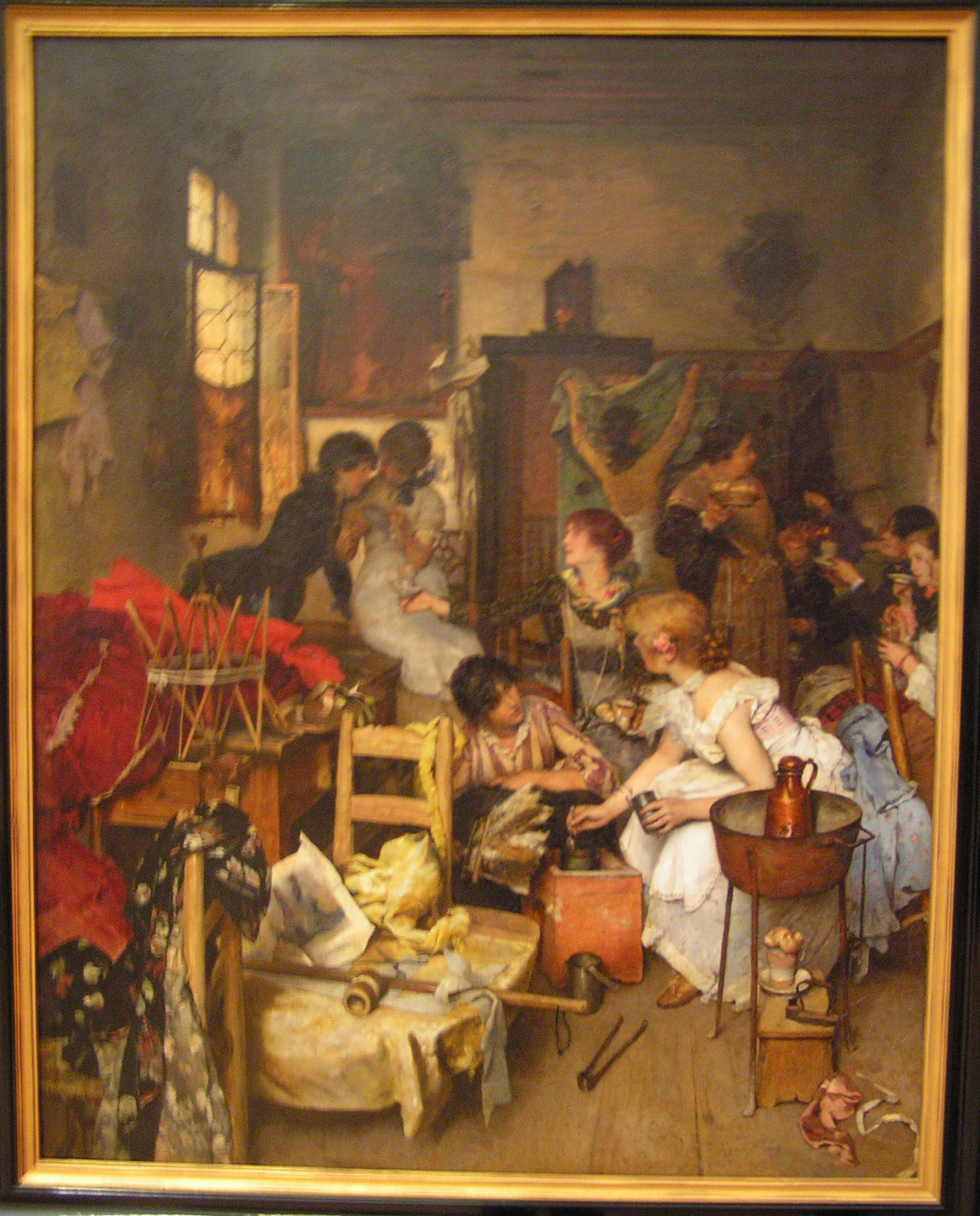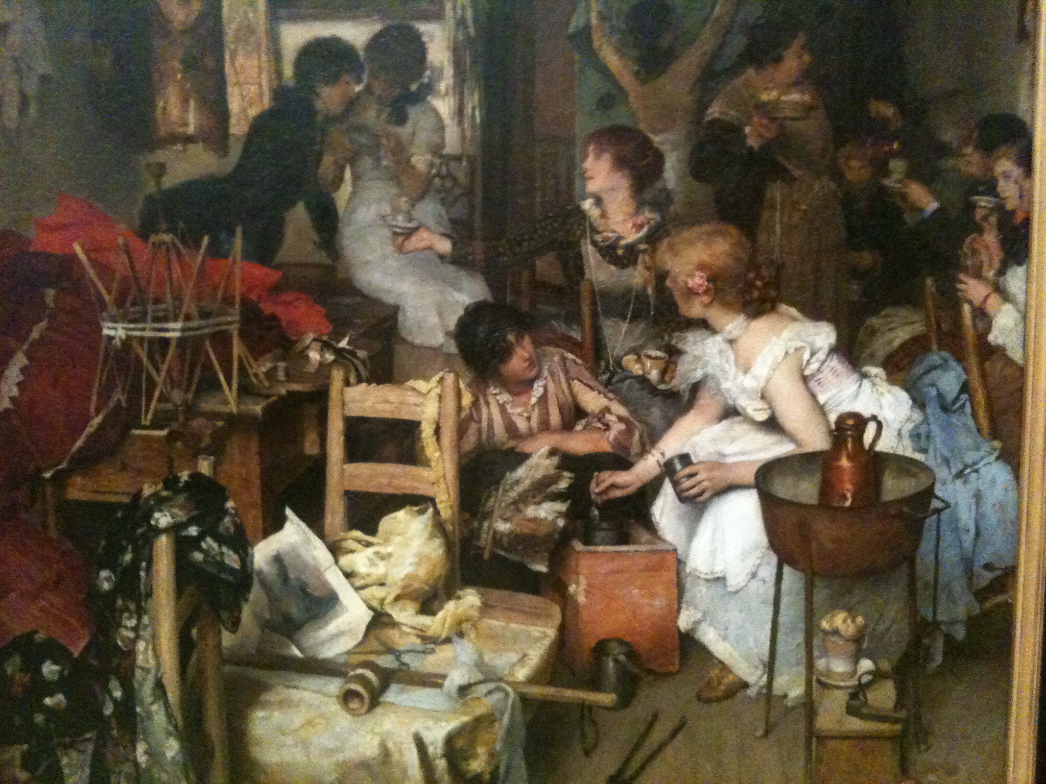Afternoon Coffee, Venice; Cecil van Haanen (1844-1914), The Netherlands, England, oil on canvas I enjoyed seeing this on view at the Auckland Art Gallery in New Zealand the other week. What do you notice in the painting? According to the text, “The convivial image of seamstresses having a coffee break details some of the tools and processes involved in their craft. In the foreground, a fashion illustration, probably torn from a popular magazine, sits atop a length of cloth laid out for cutting. The flat iron had to be heated on a stovetop, and a collapsible wooden cotton winder holds thread ready for use. Although the sewing machine had been introduced in the 1850’s, everything here appears to be sewn by hand.”
