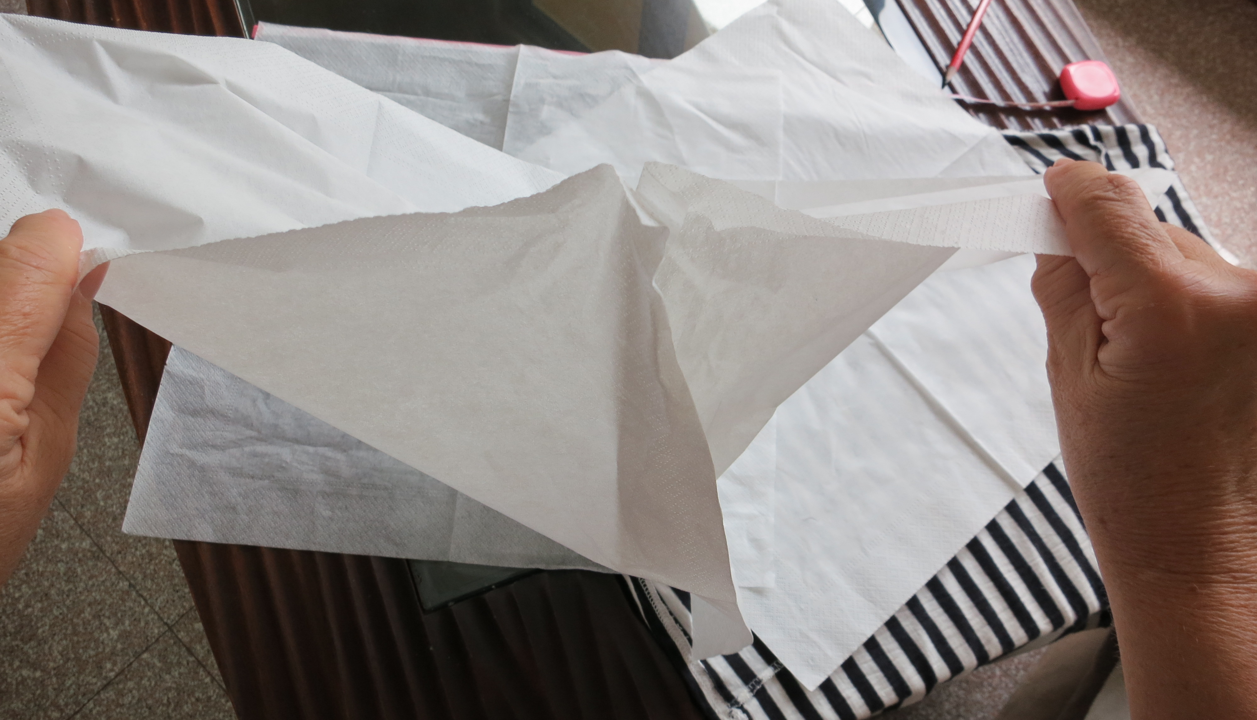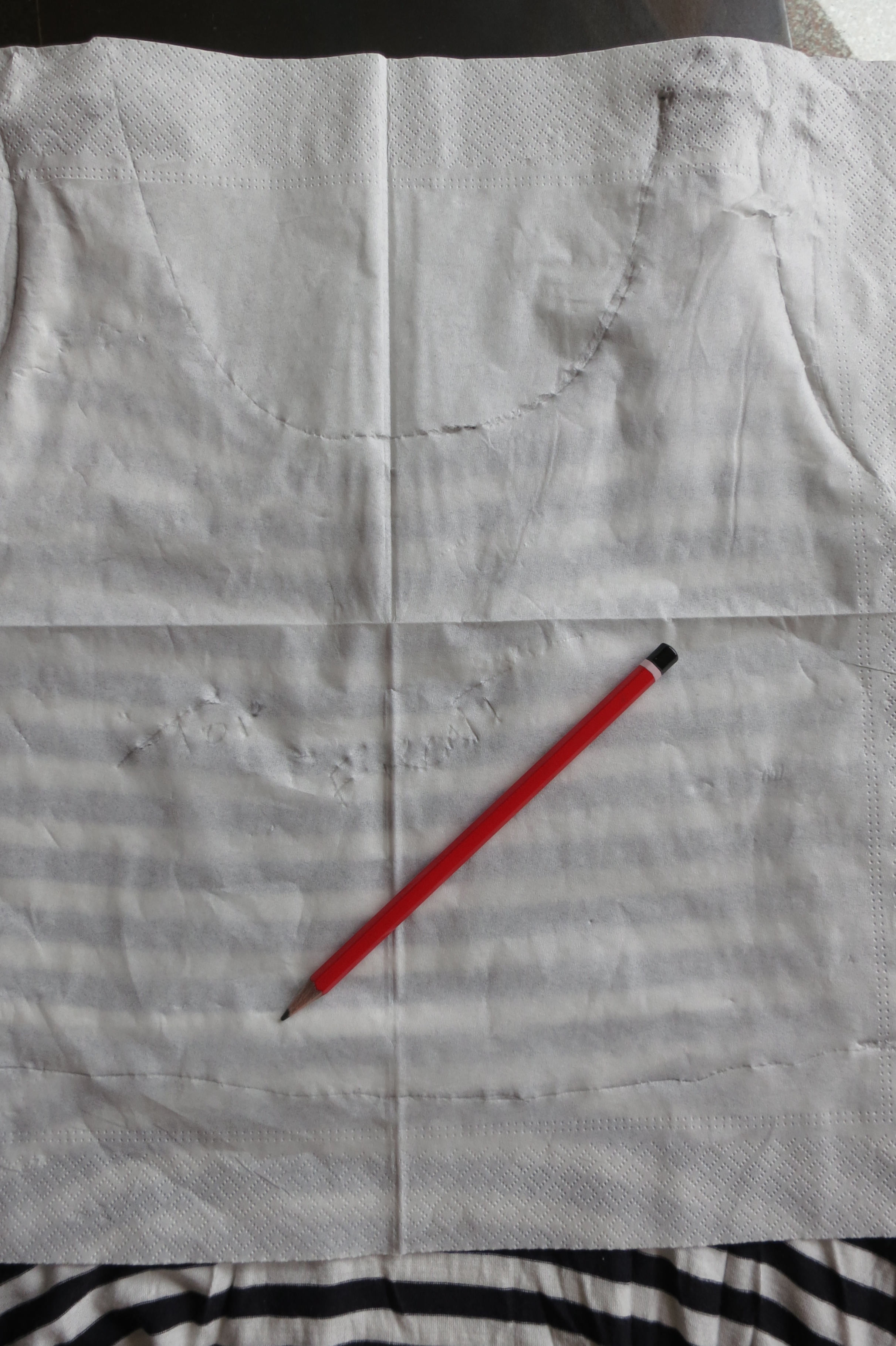 Motivated to make a pattern but don’t have tracing paper? In a country where you can’t find tracing paper? Napkins are the solution! My mom, a long time sewer, came up with the idea of taking apart a napkin and tracing around the fabric with a pencil.